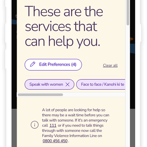 The Service Finder Tool takes the hassle out of finding the relevant services for the people who need them most. Users have the ability to filter services via location and opening hours as well as more specific requests like LBGTQIA+ friendly and NZ sign language interpreter availability.